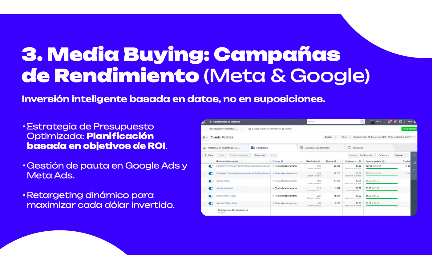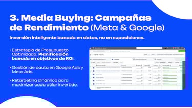 Trabajamos bajo un modelo de Growth Marketing, lo que significa que no hacemos campañas por hacerlas, sino que diseñamos, probamos y optimizamos cada acción hasta encontrar lo que realmente impulsa tus resultados.